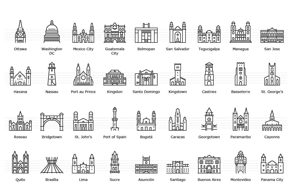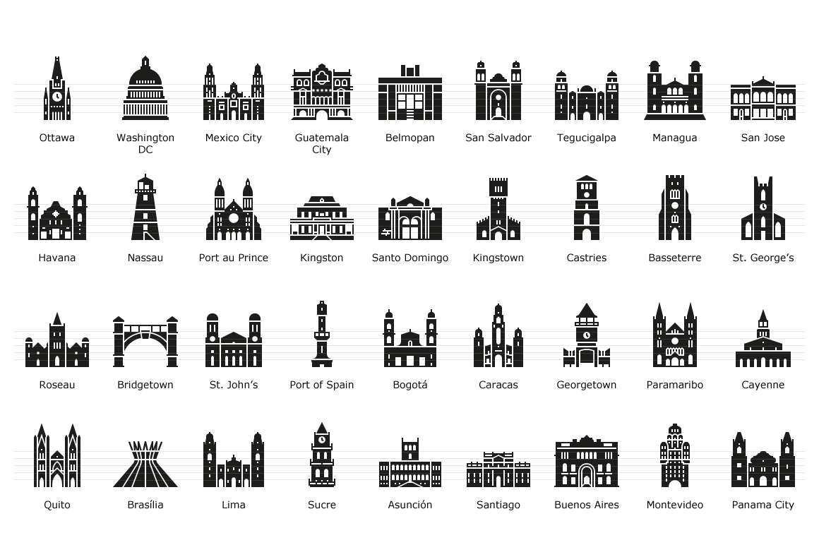 American capitals symbolized by their main landmark building. The icon set covers all the 36 American capital cities In outline and glyph style.