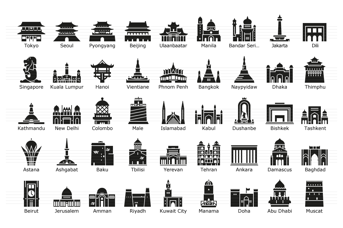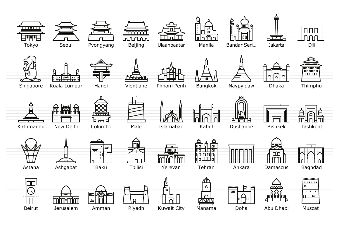 Asian capitals symbolized by their main landmark building. The icon set covers all the 46 Asian capital cities, in outline and glyph style.